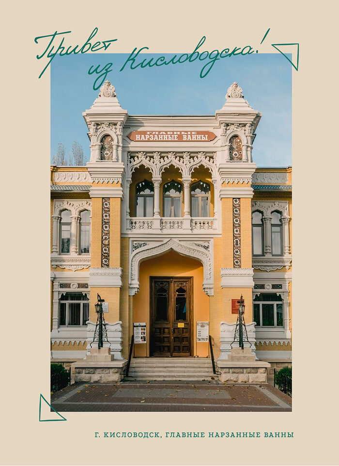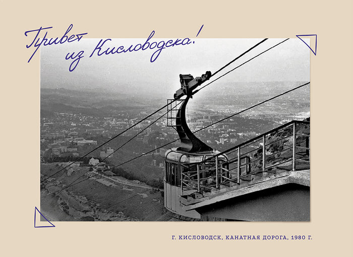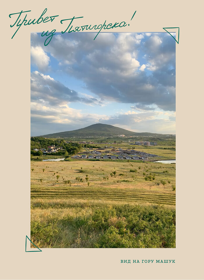 На этой открытке — просторный пейзаж с величавой горой Машук на горизонте. Золотые поля и тихие улочки пригорода подчеркивают спокойствие и величие кавказской природы.