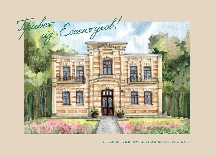 Перед вами — акварельная иллюстрация курортной дачи в Ессентуках начала XX в. Строгий симметричный фасад в окружении зелени и цветников передаёт атмосферу старинного курорта.