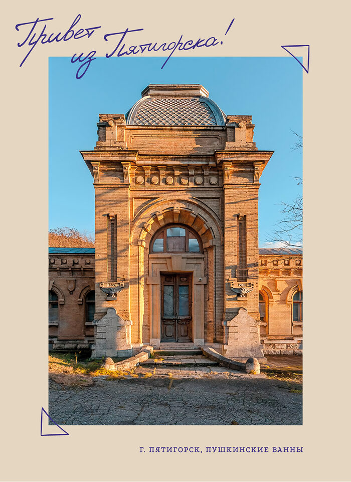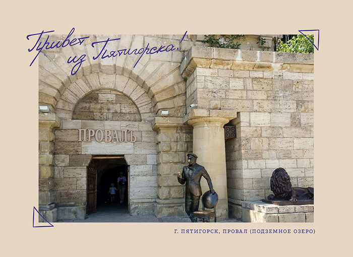На этой открытке — вход в знаменитый Провал в Пятигорске, где скрыто подземное озеро. Каменная арка, бронзовый Остап Бендер и лев встречают гостей курорта.