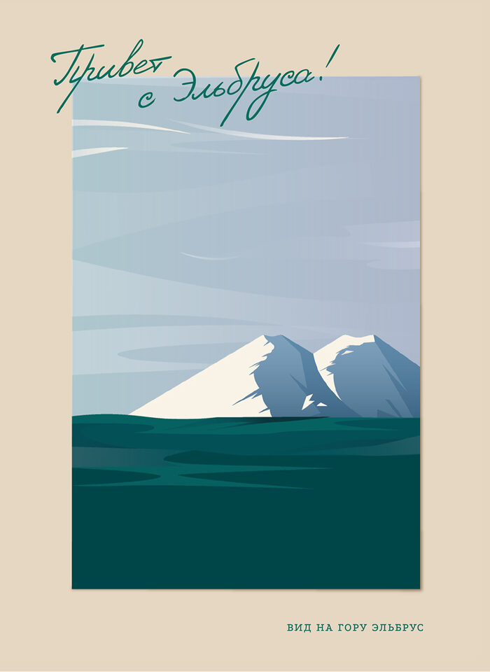 На этой открытке — иллюстрация величественного Эльбруса. Белоснежные склоны горы под мягким светом небес переданы в минималистичной манере, создавая ощущение чистоты и простора.