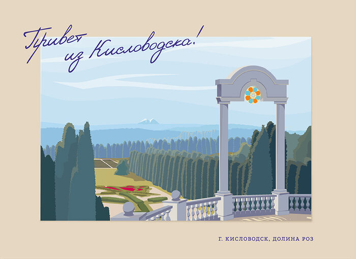 Перед вами — иллюстрация знаменитой Долины роз в Кисловодске. С террасы с изящной аркой открывается вид на ухоженные аллеи парка, цветочные композиции и горы на горизонте.