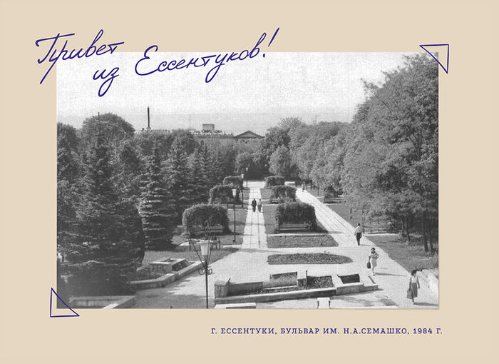 На этой открытке — архивное фото бульвара имени Н. А. Семашко в Ессентуках, 1984 год: аккуратные аллеи, зелёные насаждения и неторопливые прогулки горожан.