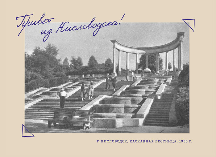 На этой открытке — архивное фото Каскадной лестницы в Кисловодске 1955 года. Величественные ступени и колоннада создают парадный вход в зелёные аллеи парка.