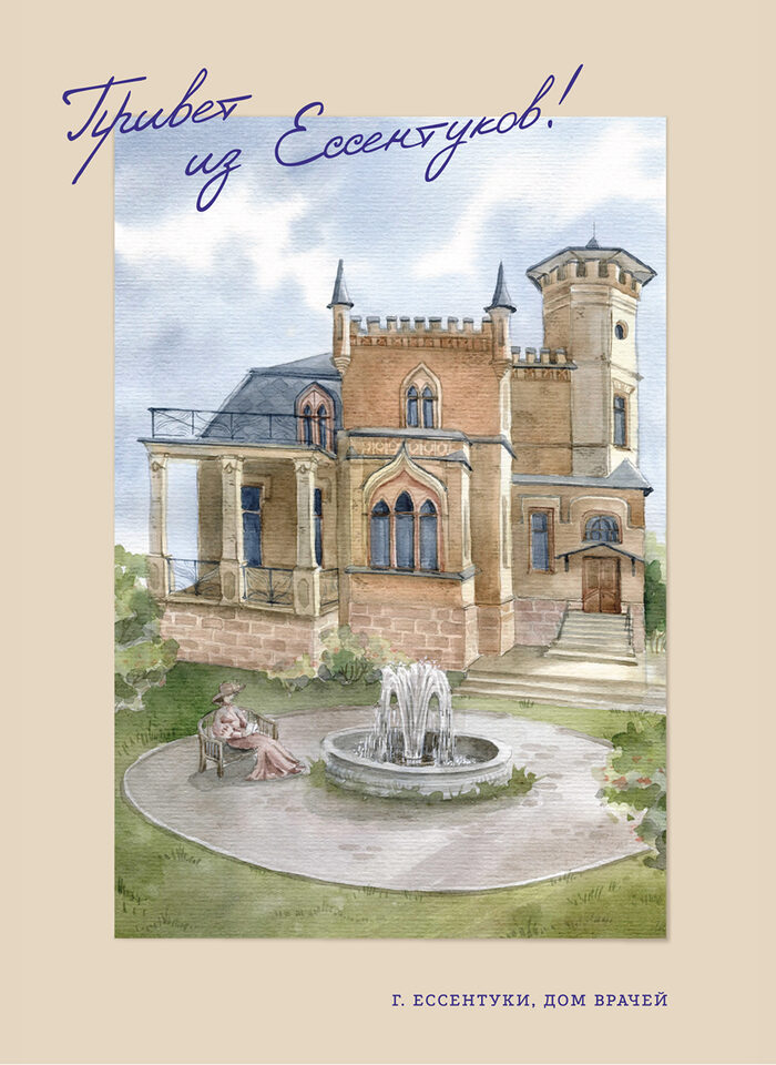 Перед вами — акварельная иллюстрация Дома врачей в Ессентуках. Неоготическое здание с башней и шпилями окружено зеленью, у фонтана отдыхает элегантная дама.